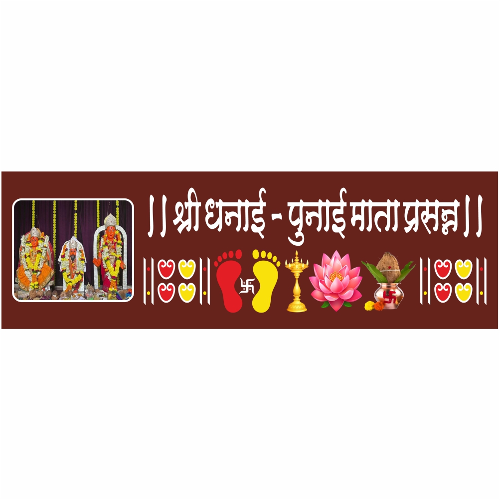 This beautifully designed Kul Devi Dhanai Punai mata Door Nameplate with Rangoli design is perfect for home entrance and pooja rooms. The plate features the divine photo of Goddess Mata along with auspicious symbols like rangoli patterns, footprints, kalash, lotus, and diya. The sacred text “॥ Shri Dhanai Punai Mata Prasanna ॥” adds spiritual charm. Made with high-quality printing and durable material, it gives a devotional and elegant look.